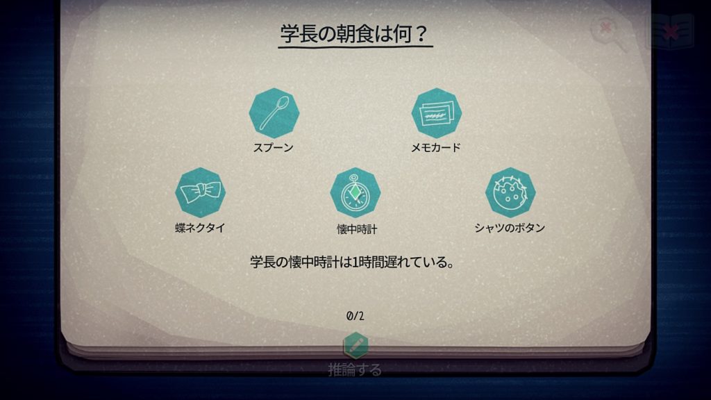 推理シーンでは、手に入れた手がかりをもとに真相を解明します。