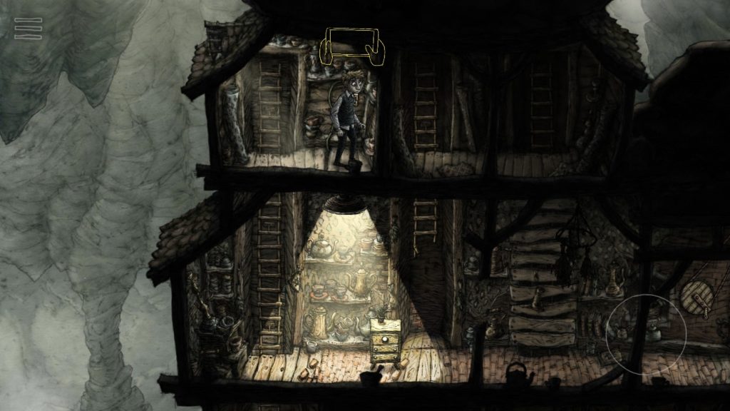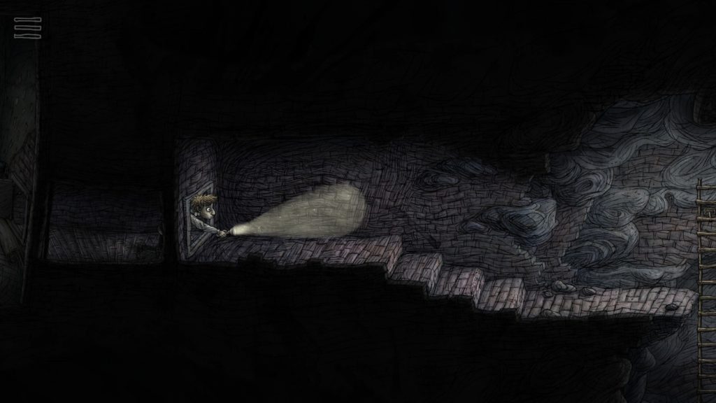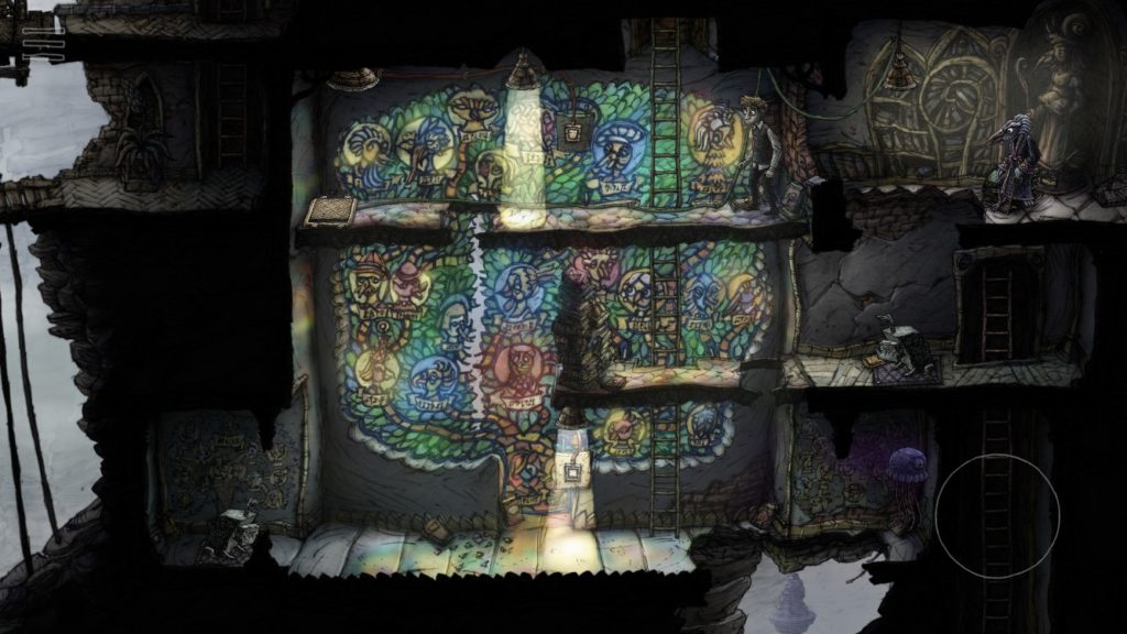 はしごの下には機械のような犬や謎の住人がいる、奇妙な世界がありました。照明やその他の仕掛けを上手く使いながら、この世界の謎を解き明かしましょう。