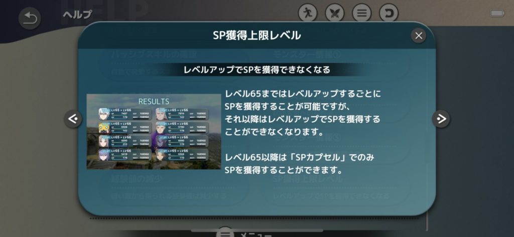 SPカプセルは、使用したキャラクターのSPを2増やすもので、成長マップでスキルやパラメータを獲得するために必要だ。また、SPはレベルアップ時にも入手できるが、下のスクリーンショットにあるように、SPが獲得できるのはレベル65までとなっている。