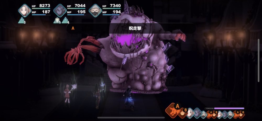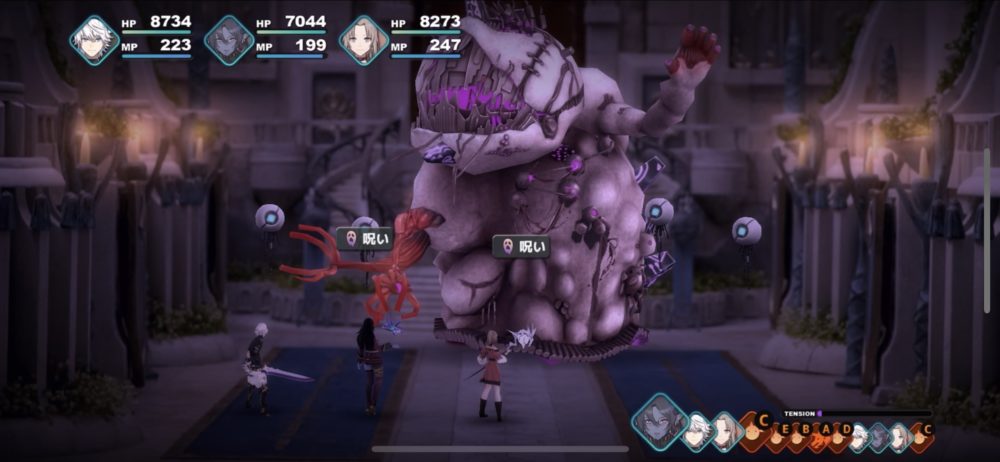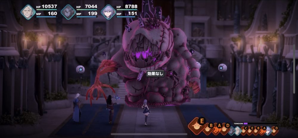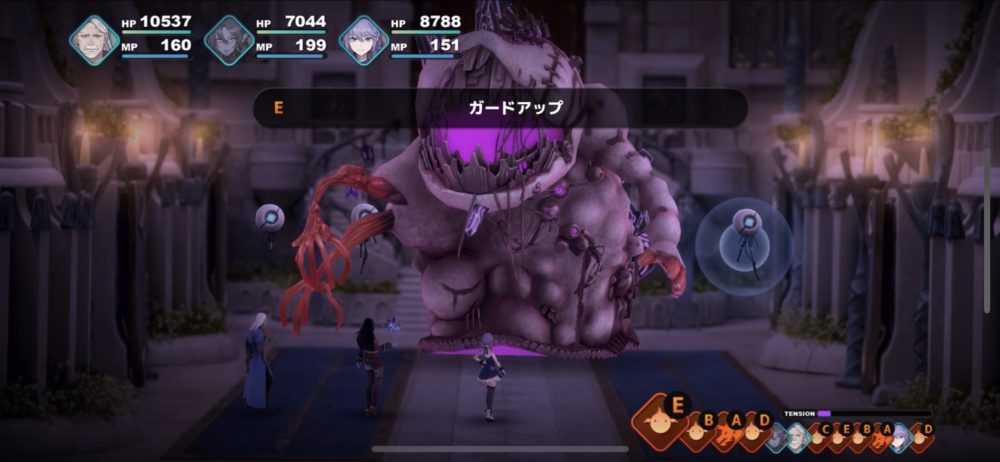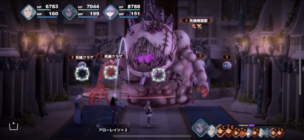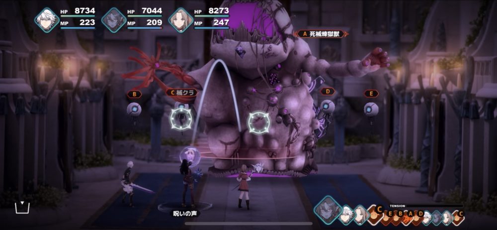 死械煉獄獣は、下のスクリーンショットのように、死械クラゲを従えて襲ってくる。死械クラゲは、こちらを攻撃してくることもあるが、死械煉獄獣を「ガードアップ」「アタックアップ」などでサポートするため厄介だ。そこで、バウリカの「呪いの声」で呪い状態にした。