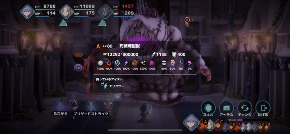 こちらからの攻撃は、シャルルの「ブリザードストライク」をメインにした。死械煉獄獣が上を向くときにタイミングを合わせ、攻撃する。