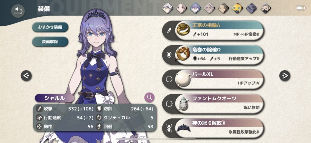 そこで、シャルルには王家の指輪(MPをHPに変換)とパール(宝石)を装備した。その他のHPが低いキャラクターもパールを装備し、全員のHPを7000以上にした。またHPアップ以外に、呪い、石化対策も必要となるため、装備枠が残っている範囲で対策し、再戦を挑んだ。