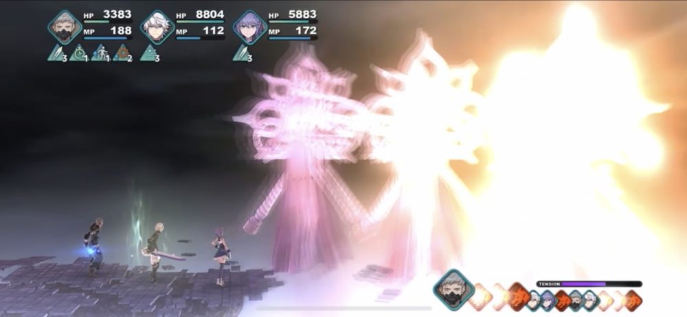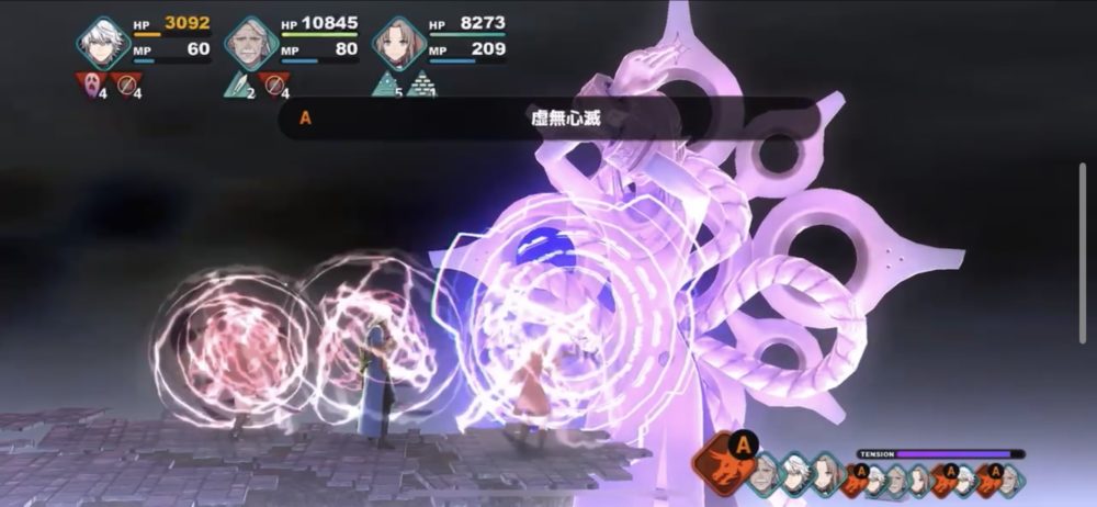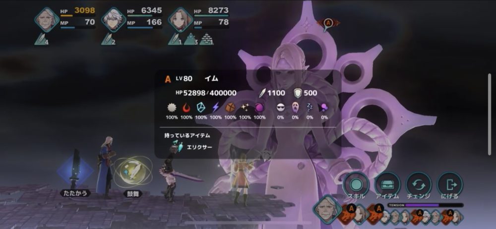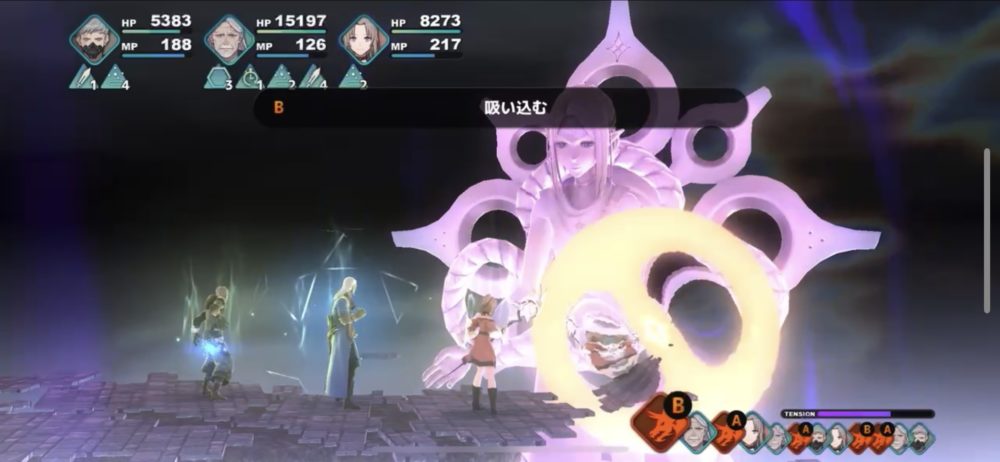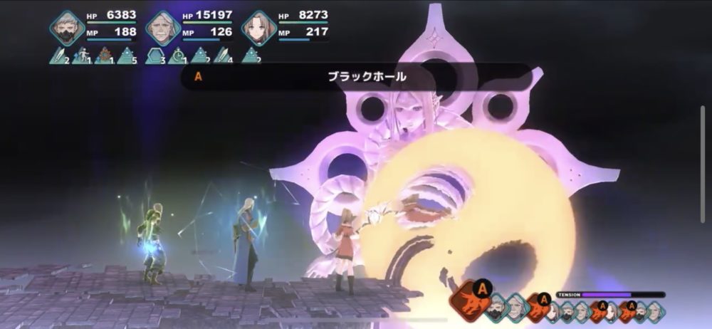 イムの攻撃パターンは、ブリザードなどの単体魔法攻撃→ゴッズ・ブルカ召喚→虚無崩壊→虚実混交→ブラックホールが基本のようだ。それぞれの攻撃に対応しつつ、レオアの五月雨などでダメージを与えていく。