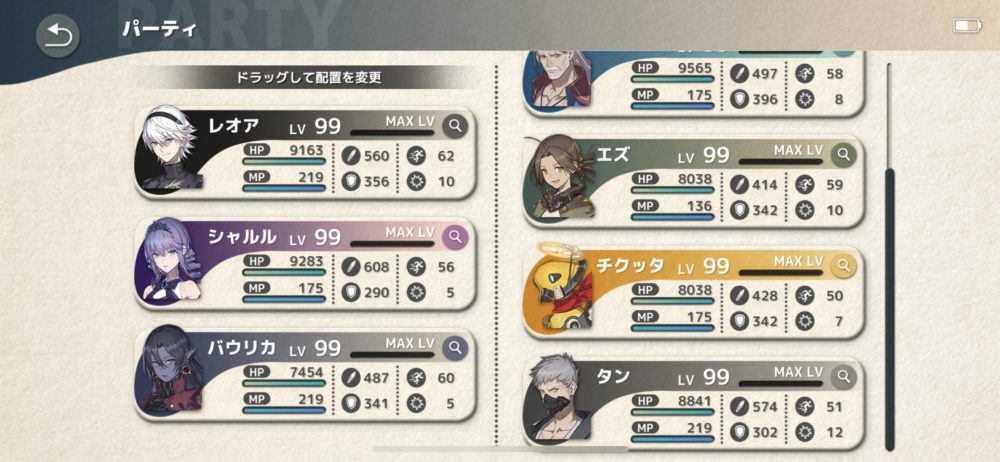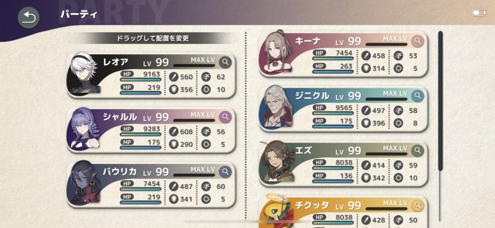 各キャラクターのステータスはこちらの通りだ。ただし、各キャラクターの成長マップの1枚目はコンプリートし、2枚目には手を付けていない。また、攻撃などのステータスは装備による補正を含んでいる。各キャラクターのレベル(Lv99)の右には「MAX LV」と書かれており、レベル99が上限であることが分かる。
