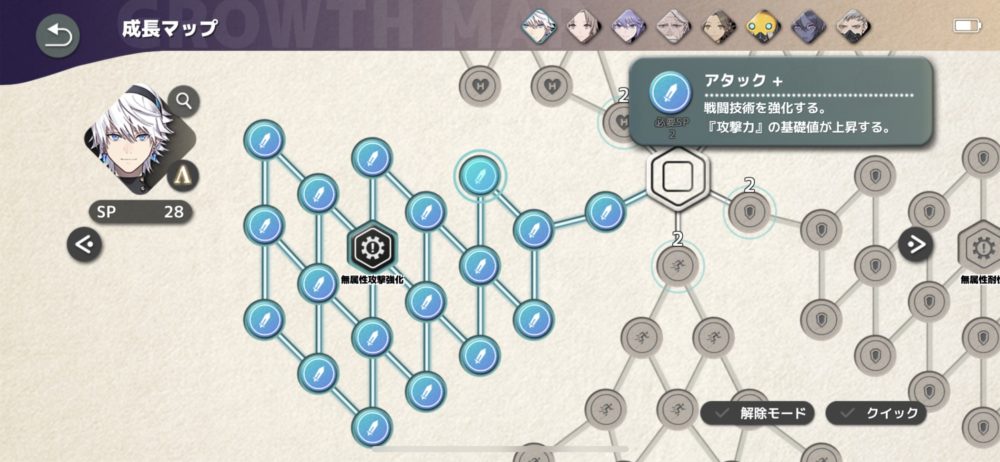 そのような状況ではあるが、成長マップの1枚目をコンプリート後、SPカプセルを18個使うことにより、このように2枚目の成長マップの左側にある「アタック+」を18か所アンロックすることにより攻撃力を最大にできる。
