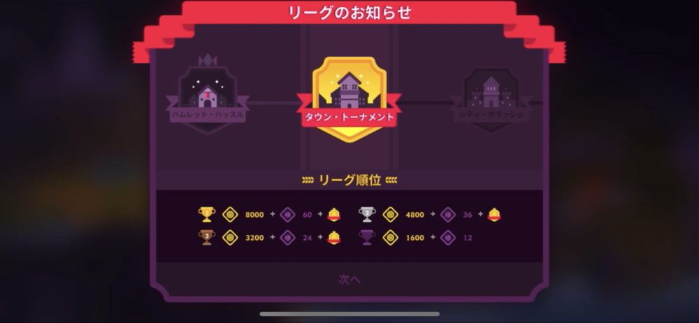 次のリーグは「タウン・トーナメント」だ。リーグ戦終了時にもらえる報酬が表示されている。