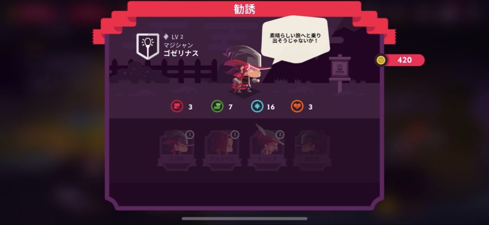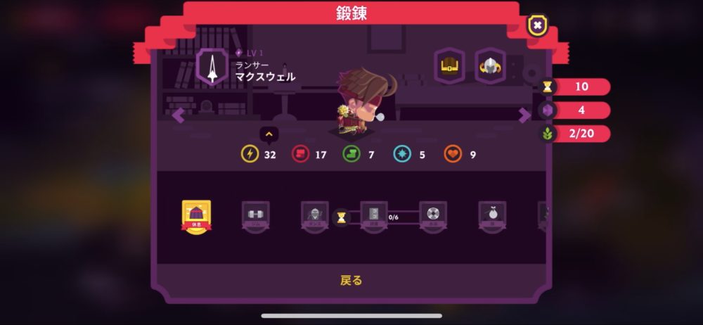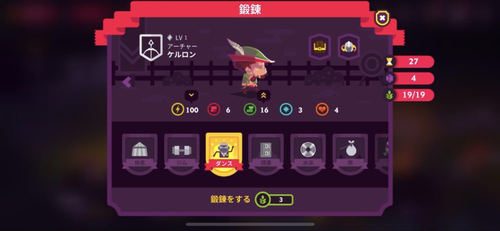 アーチャーのケルロンは素早さ(遠隔攻撃の物理ダメージ、クリティカル率、回避率に影響する)のみ強化している。活力(最大体力値に影響する)は4しかないが、マクスウェルなど前衛が倒れない限り相手の攻撃を受けることはないので、今のところはこれで良いと思う。