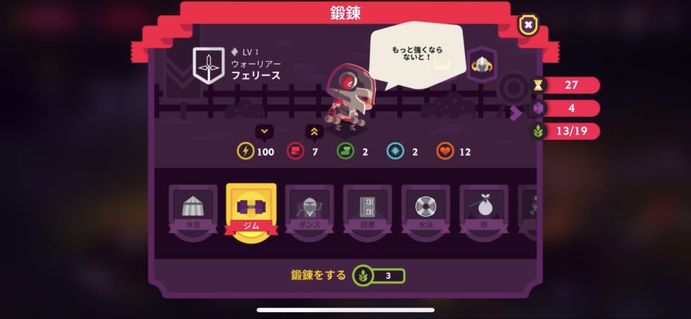 2か月目に1つの街の番人となり、毎月獲得できるゴールドが少し増えた。だが、4人目のスロットを開放するための3000ゴールドには、まだ届かない。そこで、ゴールドを増やすためクエストに参加しつつ、3人のユニットを「鍛錬」してパラメータを強化していくことにする。