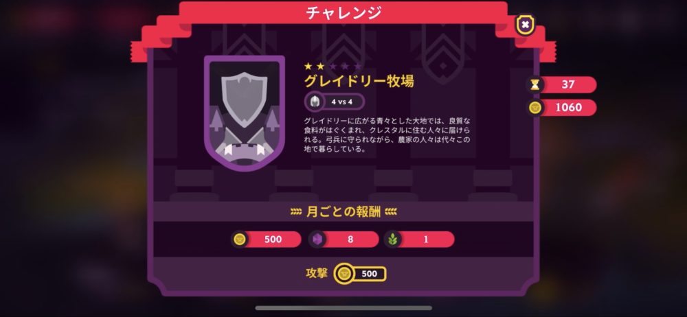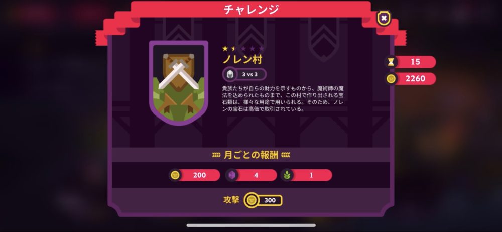 先月はクエストなどで体力が消耗していたので挑戦を控えたが、今月はノレン村の番人に挑戦してみる。バータリウムブルクと同じく3対3だが、☆が1.5と、少し難易度が上がっている(バータリウムブルクは☆1)。