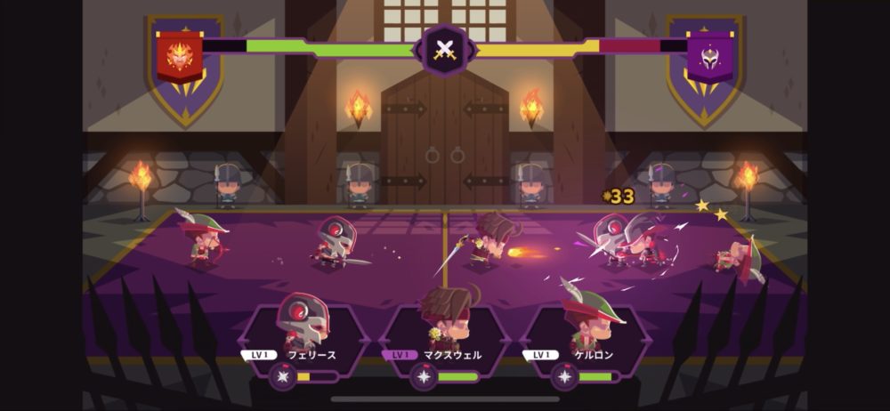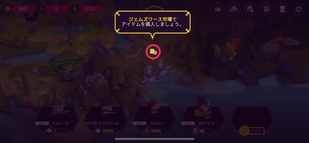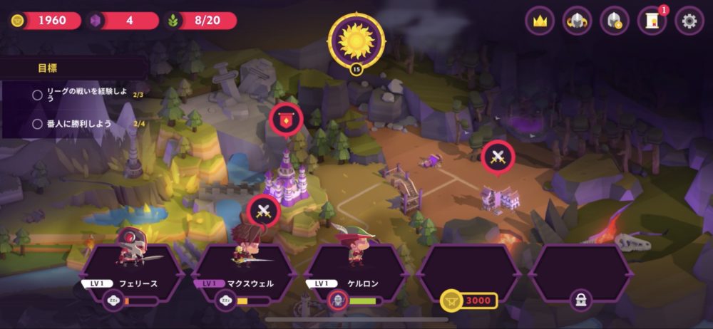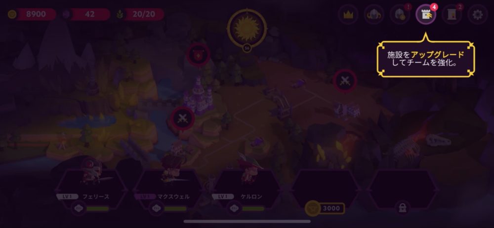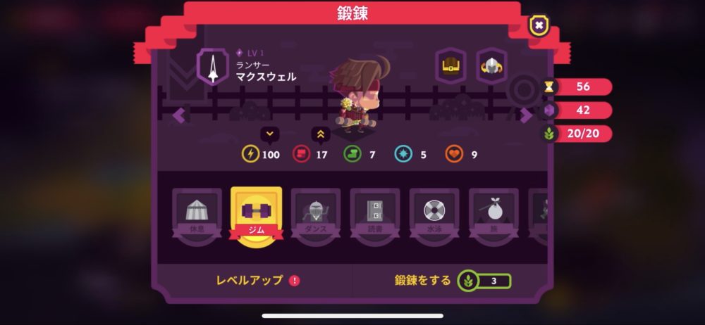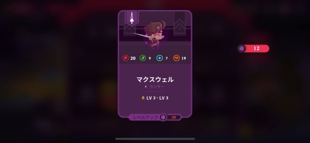 宝石が42個になったので、前に出て戦うマクスウェルをレベル3までアップさせる(レベル1から2には宝石10個、レベル2から3には宝石20個が必要なので、レベル3までレベルアップできる)。