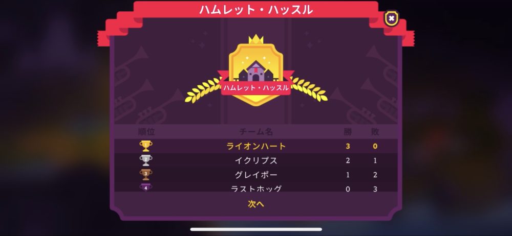 ・リーグ戦(3戦目)勝利→ハムレット・ハッスルで1位