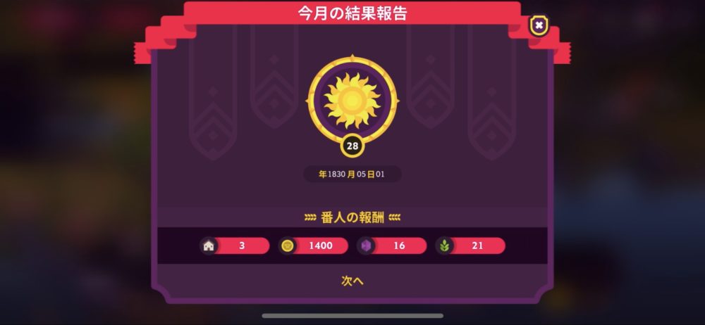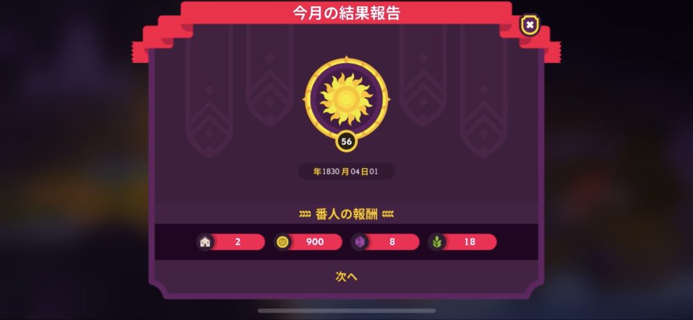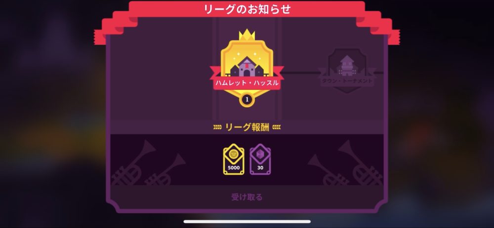 新たなリーグが始まった月は、リーグ戦が開催されない。今月の報酬はこちらの通りだ。4か月で3つの街の番人になり、毎月獲得できるゴールド、宝石、鍛錬ポイントが少しづつ増えている。来月も番人に挑戦して報酬を増やしていこうと思う。