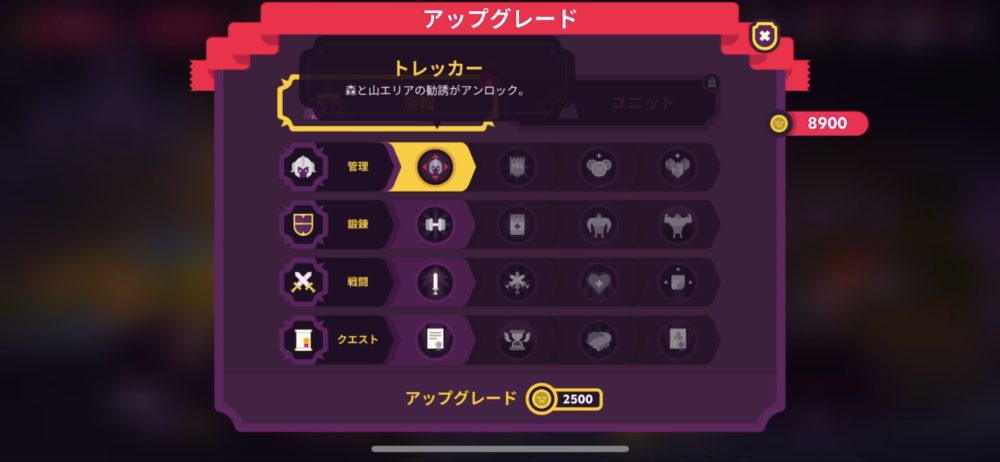 ゴールドが8,900なので、色々アップグレードできるが、「トレッカー」「バトルボーン」の2つをアップグレードした。