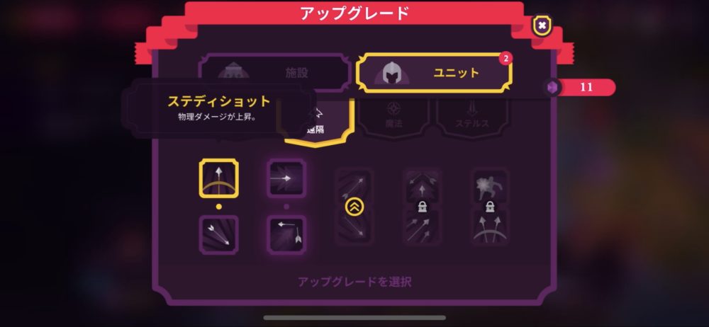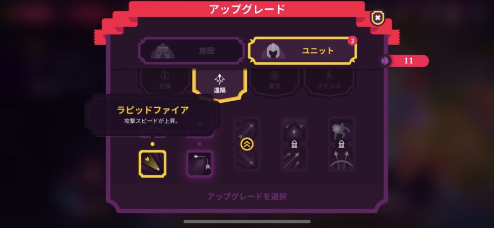 続いて、ユニットのアップグレードで「遠隔」の第2段階までをアンロックした。1段階ごとに、2種類のアップグレードから1つを選ぶことができる。第1段階では物理ダメージが上昇する「ステディショット」と攻撃スピードが上昇する「ラピッドファイア」だ。