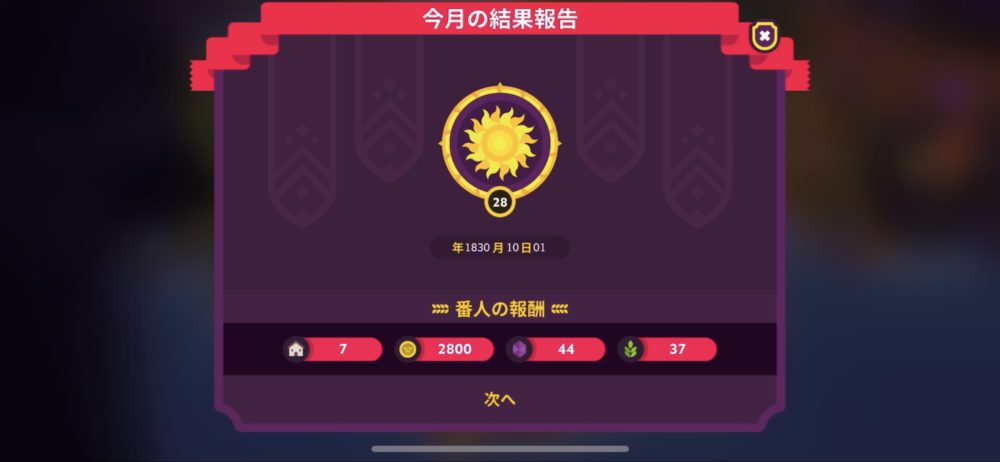 今月の報酬はこちらの通りだ。番人への挑戦ではようやく順調に勝てるようになってきた。毎月獲得できる宝石が40を超えたので、ユニットのレベルアップなど、パーティー強化のペースを上げていくことができると思う。