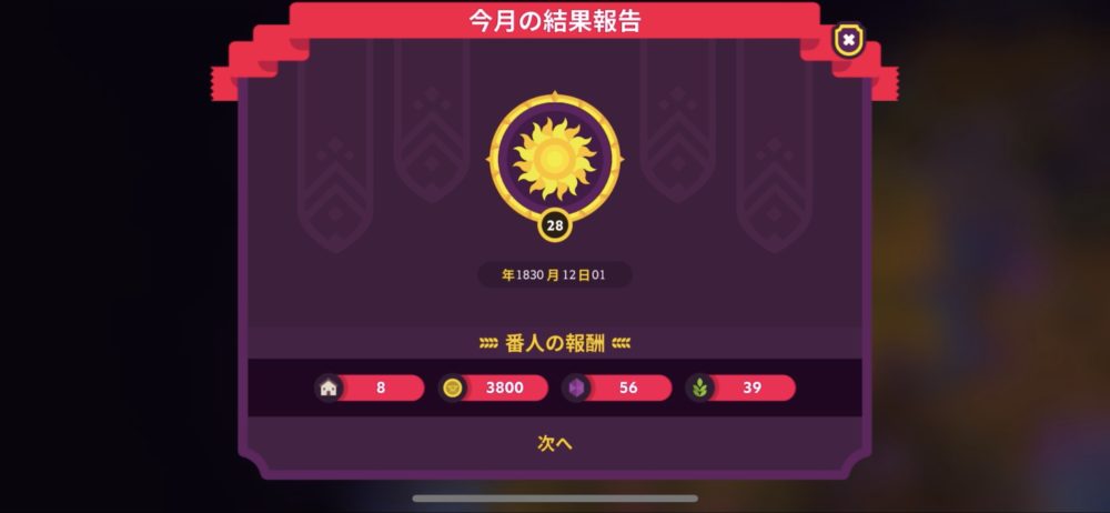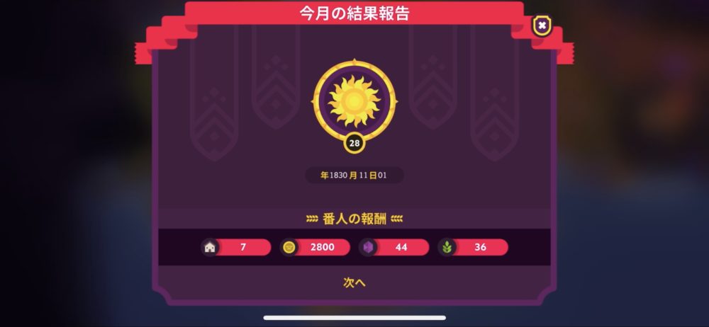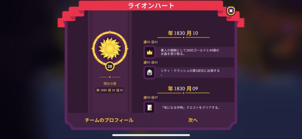 ホーム画面の上にある太陽のようなアイコンをタップすると、現在の暦や直近の主要イベントが表示され、チームの状況を確認できる。ゲームスタート時は1830年1月なので、10か月目であることが分かる。