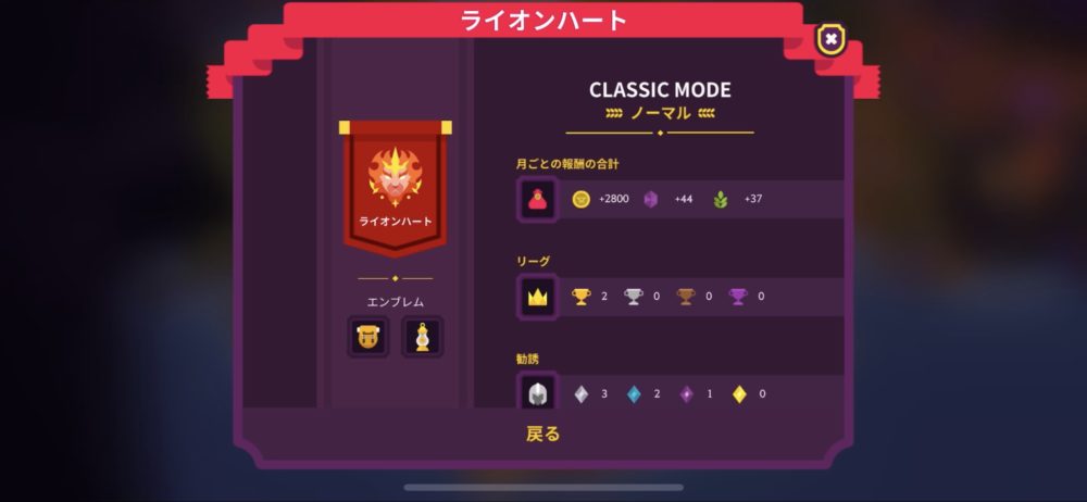 「チームのプロフィール」をタップすると、月ごとの報酬や、ゲーム中のイベントの達成状況などが確認できる。「リーグ」より1位が2回で、「勧誘」より、勧誘したユニット(リーダーも含まれる)はコモン3人、レア2人、エピック1人であることが分かる。