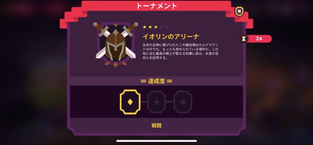 マジシャンを体力回復ができるアコライトに、アーチャーを貫通力のある攻撃ができるハンターにクラスチェンジさせ、戦力は確実にアップしているので、イオリンのアリーナに挑戦する。このイベントは3つのトーナメントで構成されるが、最初は難易度ランク☆3のビギナー級トーナメントから挑戦していくことになる。