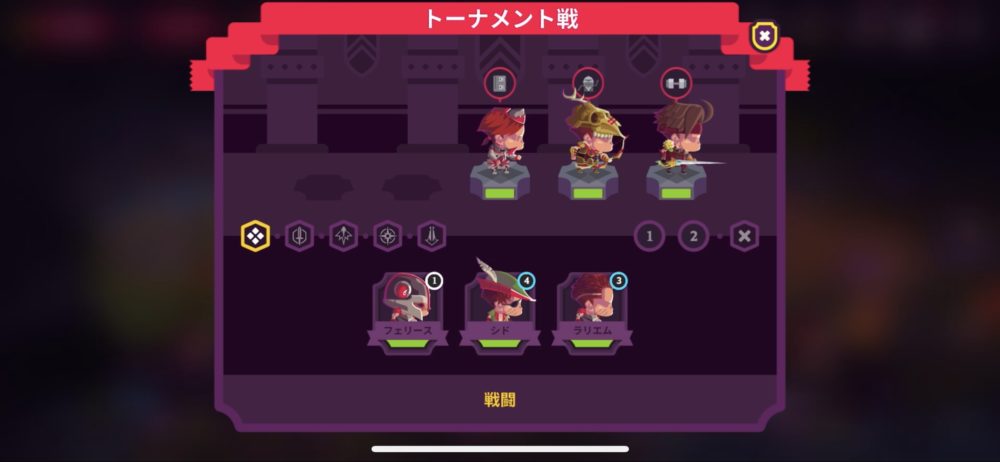 このように、トーナメント戦では3人を選んで参加する。ランサー(マクスウェル)、ハンター、アコライトの3人で挑戦だ。