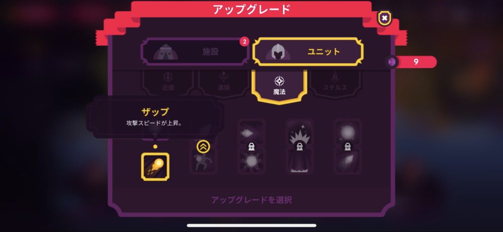 ・ユニットアップグレードで「魔法」の第1段階をアンロックし「ザップ」を選択