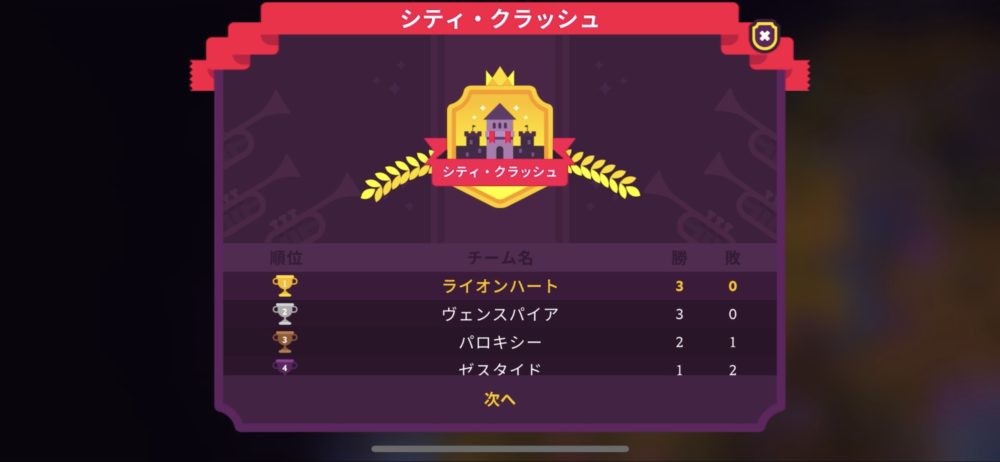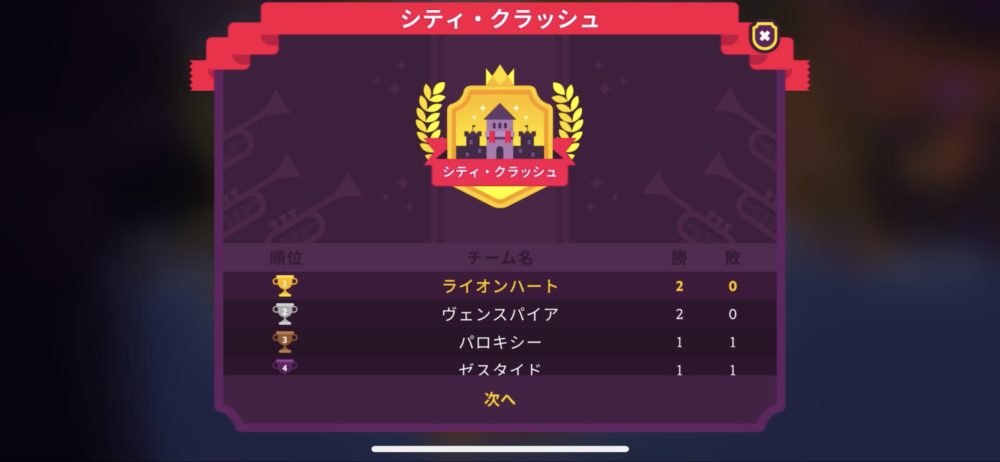 先月と同じく5対4のため、簡単に勝てた。シティ・クラッシュでは今のところ3戦全勝と好調だ。