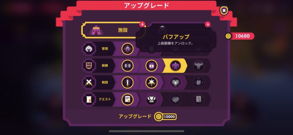 先月の報酬によりゴールドが10000を超えたので、バフアップをアンロックした。これで上級鍛錬がアンロックされ、ステータスが上がりやすくなる。