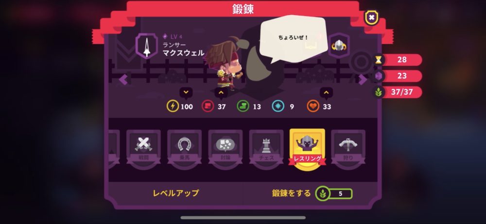 マクスウェルをレベル4にレベルアップし、上級鍛錬の「レスリング」を選んだ。上級鍛錬は、鍛錬ポイントが5必要だが、攻撃力と活力をアップさせることができる。