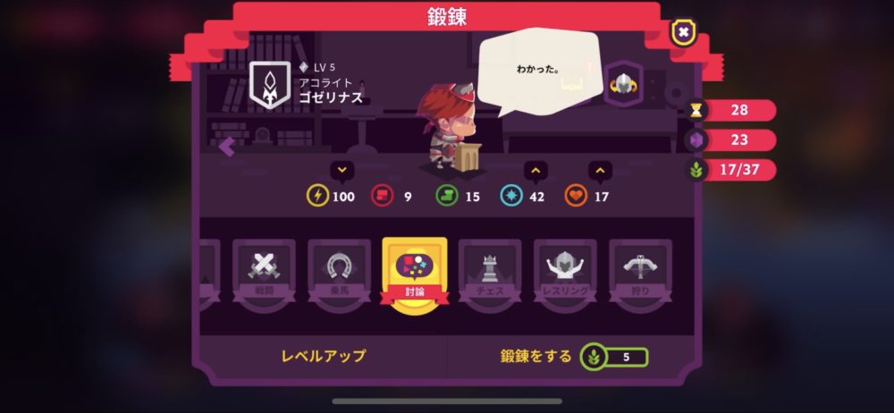アコライトは討論を選び、知力と活力をアップさせる。