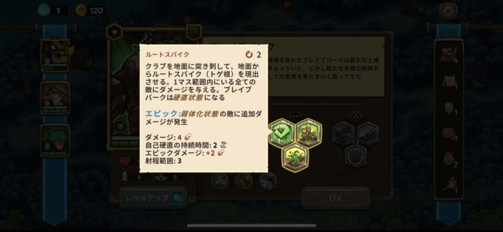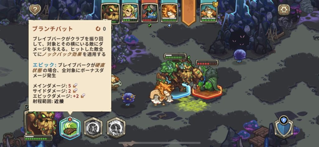 一方、攻撃力は高く、特にレベル2になると「ブランチバット」で8ダメージを与えることができるので、一回の攻撃で倒せる敵も増えて楽に戦いを進められるようになる。さらに、スキルの追加効果「エピック」が発動すると、追加ダメージを与えられる。