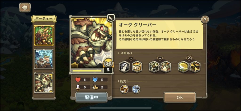 オーク クリーバーはHP、防御力のバランスが良い近接攻撃ユニットで、敵の近接攻撃に対してカウンターを発動する。レベルが上がって攻撃力が増えると、カウンターで敵を倒してくれることもあり、心強い。ブレイブバークと交代で壁役として使おうと思う。