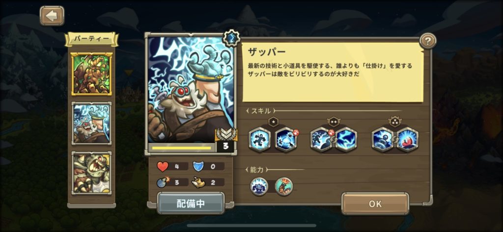 さて、仲間キャラクターは、試行錯誤を繰り返してザッパー、オーク クリーバーとした。ザッパーは「雷電球」や「連鎖電流撃」のスタンで敵を足止めし、ブレイブバークの打たれ弱さをカバーしてもらおうと思っている。