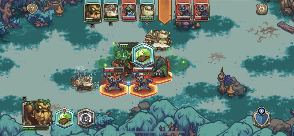 画面中央付近の青い玉のようなものに攻撃を当てると、地面が緑色のエリアが出現し、この上にいるユニットは行動後にHPが1回復する。ブレイブバークとオーク クリーバーはここで敵の攻撃を食い止めることにする。