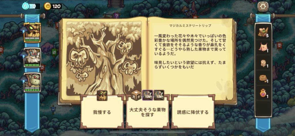 マップに配置されるイベントは毎回変わるので、その都度ルートを選んで進むことになる。今回はスタート地点から下のルートを進むことにした。