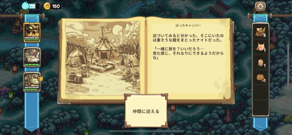 すると、次のイベントでナイトを仲間に迎えることができた。ナイトは敵をスタン状態にできるスキルを持っているが、攻撃力は高くないので、微妙なところだ・・・