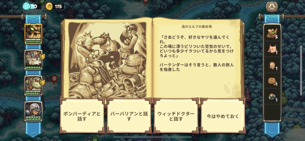 酒場ではこのように3人の中から仲間にするユニットを選ぶことができる。回復スキルを持つウィッチドクターも魅力的だが、バーバリアンを選ぶことにする。