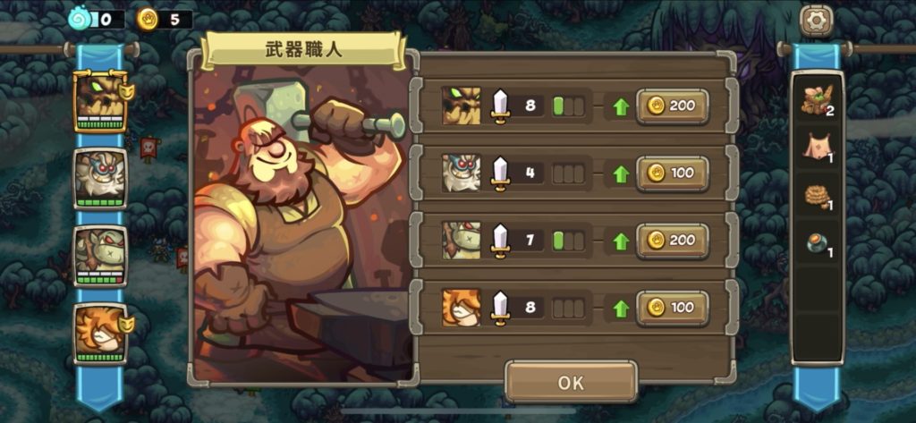 武器職人の所では、ゴールドを使ってユニットの攻撃力をアップさせることができる。200ゴールドを使ってブレイブバークとオーク クリーバーの攻撃力をそれぞれ1アップさせた。