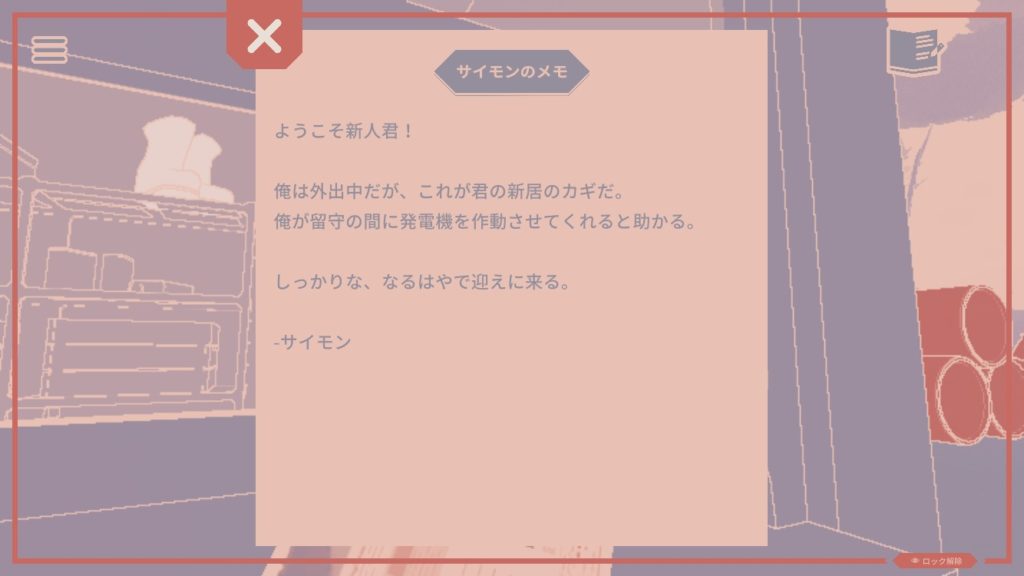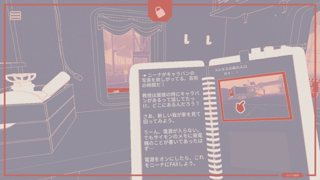 キャラバンのドアのカギは、管理事務所風の建物の窓に貼ってある。また、サイモンのメモで、「発電機を作動させてくれると助かる」と書いてあるが、電気が使えないとキャラバン内の設備が使用できないので、作動は必須となる。