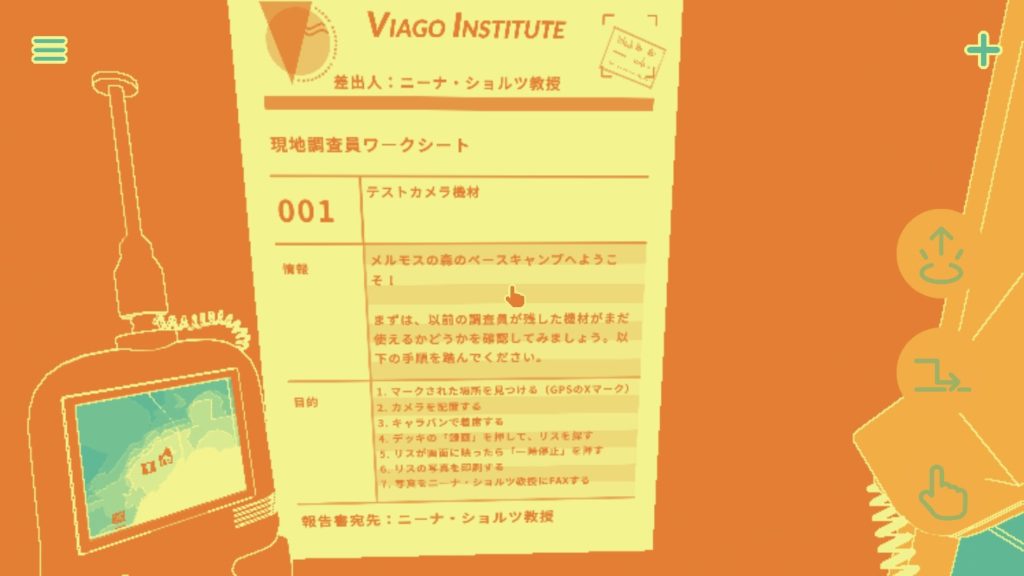 メルモスの森に到着した後、電話の下にあるチェックシートをFAXで送ると、教授からワークシートが送られてくる。調査員がやるべきことが詳しく書いてあり、それに従って調査を進めていくことになる。
