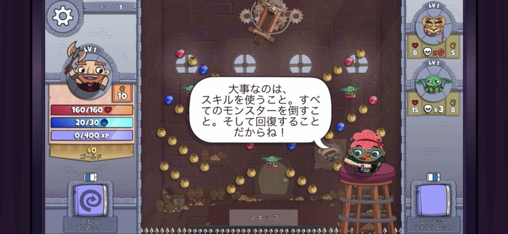 プレイヤーができることは、狙いを定めてヒーローをバリスタで打ち出し、その後はスキルを使うことだけだ。ただ、スキルを使うとマナを10消費するので、使いどころを見定める必要がある。