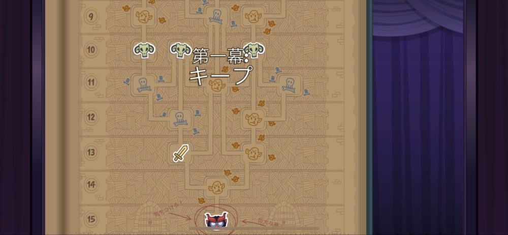 第1幕はこのように15階層から構成されていて、各階層に掛かれているシンボルは敵のタイプを表している。また武器やアーマーのシンボルは宝の部屋を表している。