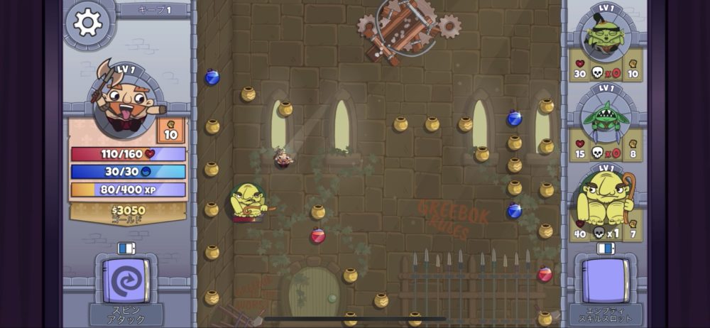 こちらはステージ開始時の一例だ。中央には「ゴールドポット」と呼ばれる壺や赤、青のポーション壺や敵が配置されており、下端には「スパイク」と呼ばれる、くぎのようなものが出ている。
