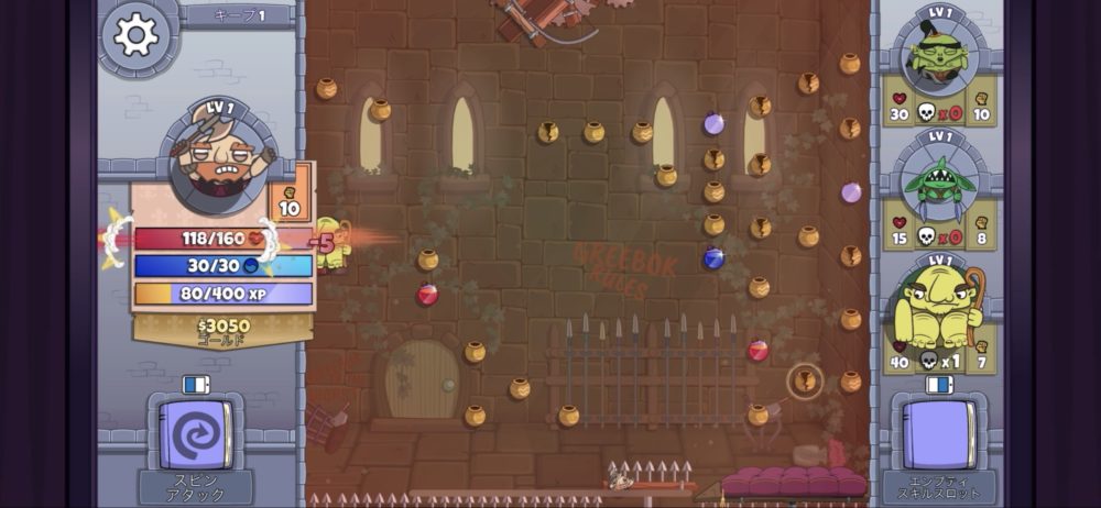 このようにヒーローが打ち出され、あとは敵やゴールドポットなどにヒットして跳ね返りながら落ちていく。赤と青のポーションはそれぞれヘルス(HP)、マナ(HP)のポーションで、ヒーローでヒットすると回復できる。