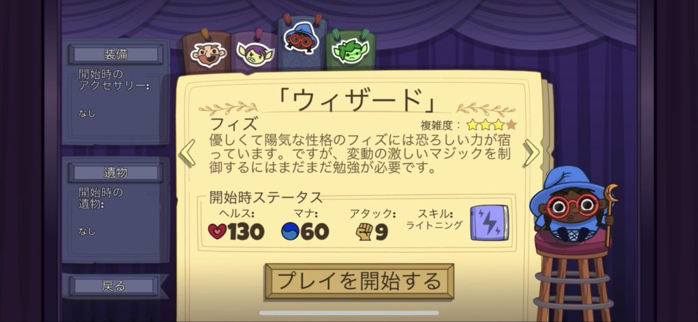 ノーマルではヒーローを1人選んでプレイするが、デイリーパズルでは、このようにヒーロー、開始時の装備、ルールが指定されている。