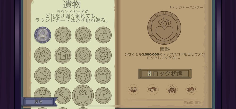 他にも様々な効果をもつ遺物があり、左下のようにノーマルランで勝利、つまり第3幕のボスを倒してクリアするとアンロックできるものや、右下のように2,000,000のトップスコアを出すとアンロックできるという、かなり難しい条件もある。