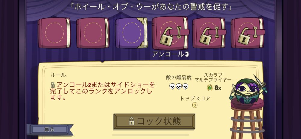 こちらがアンコールランクの画面だ。このように3つのステージがアンロックされ、3つのステージがロックされている。アンコール1のルールは、第1~第3幕のボスがランダムで別バージョンとなることだ。