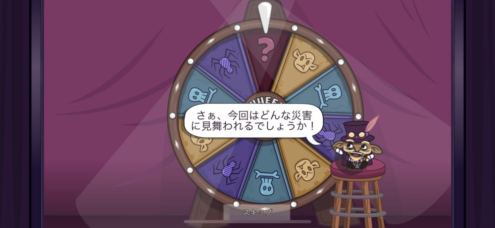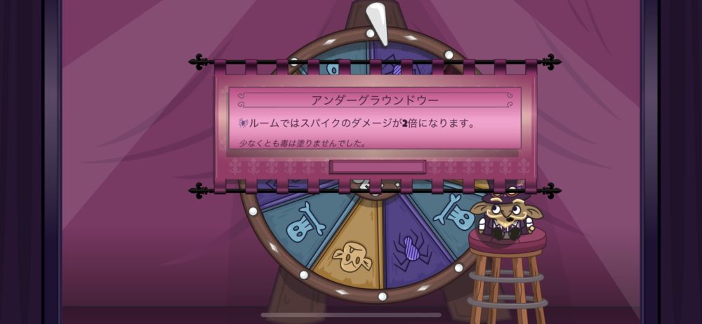 ルーレットが止まったところに応じて何らかの「良くない効果」が付与される。この場合は、蜘蛛ルームではスパイクに落ちた時のダメージが2倍になるので、なるべく蜘蛛ルームは避ける方が良さそうだ。