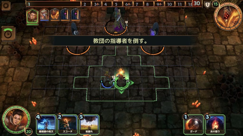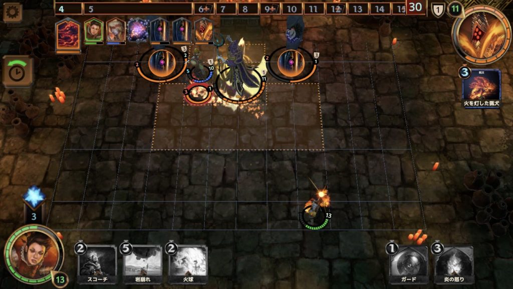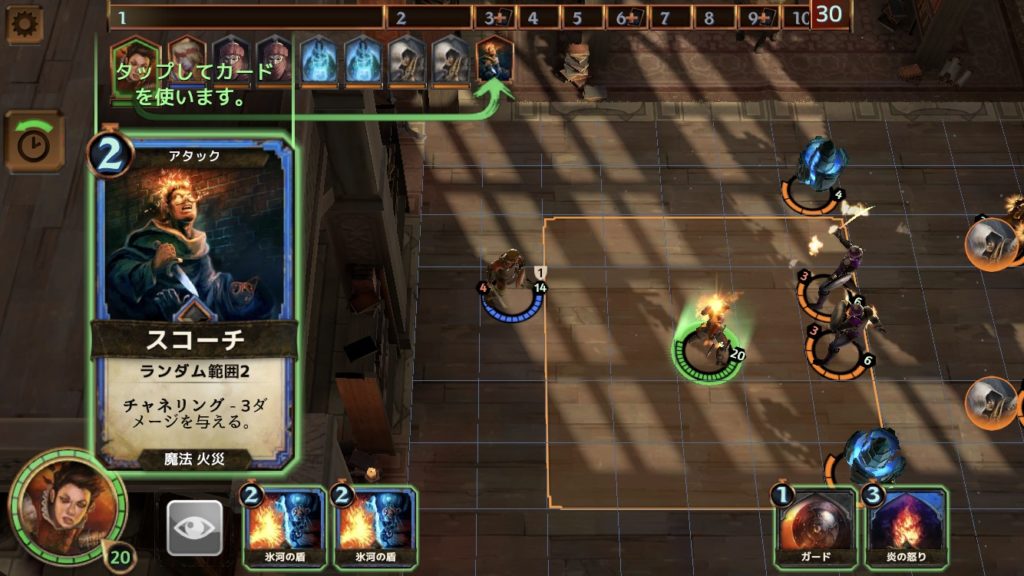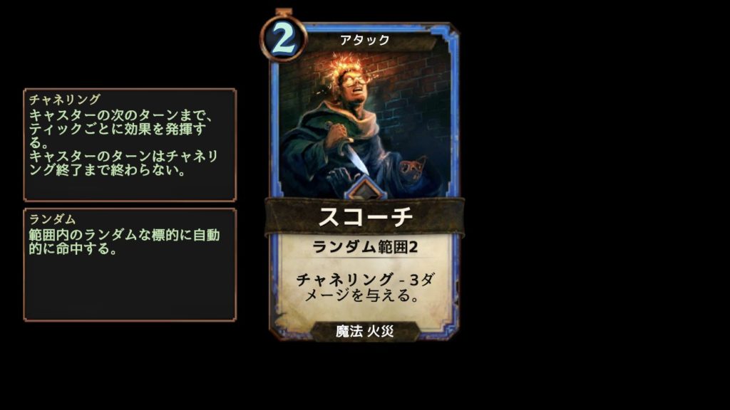 ここで、チャネリングという新たな種類のカードが登場する。スコーチの場合では、1ターンと2ターンに、レンナを中心とした範囲2以内(オレンジ色の枠の内側)のランダムな敵(1体)に、3ダメージを与える。