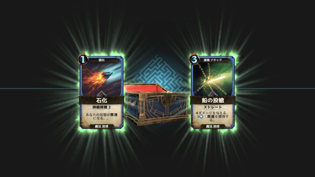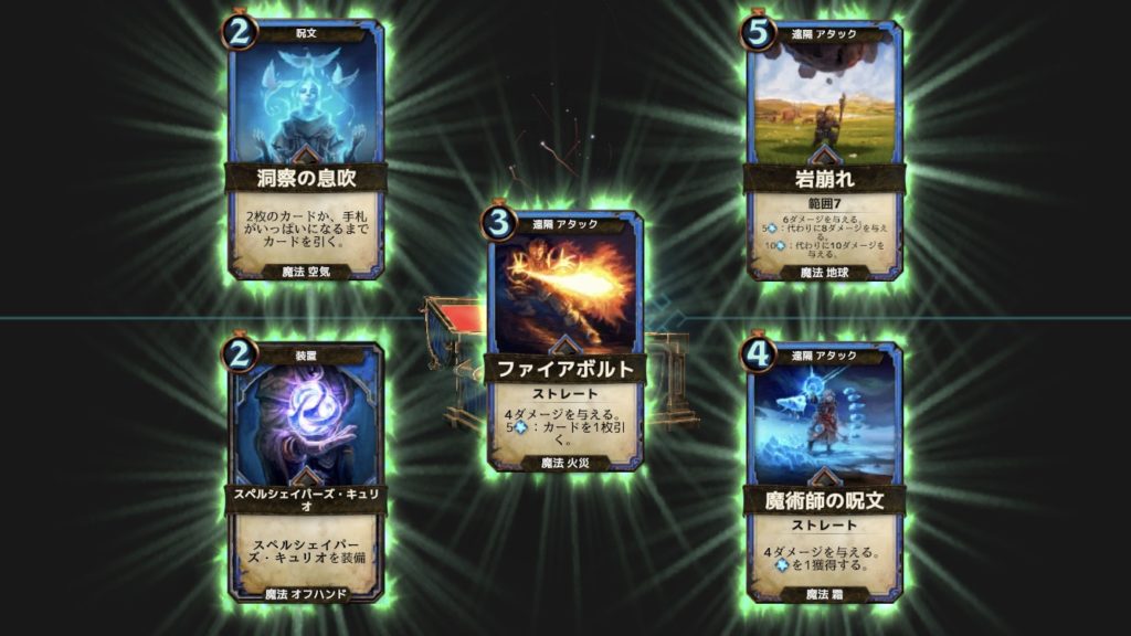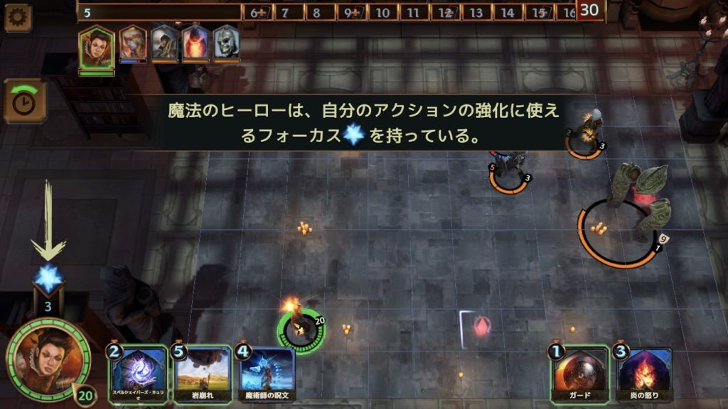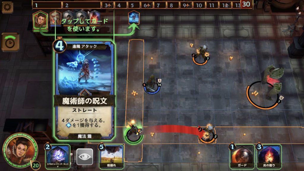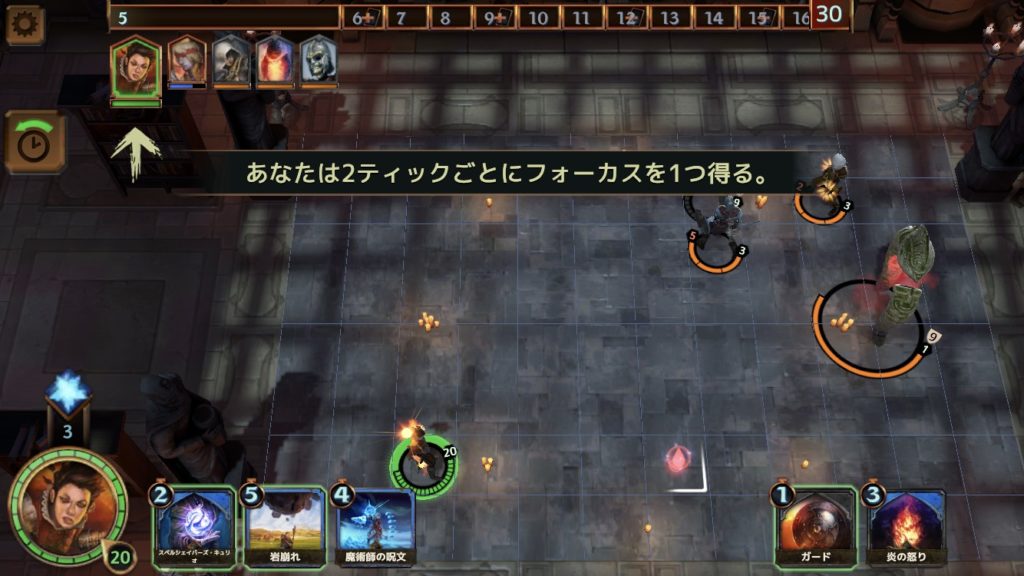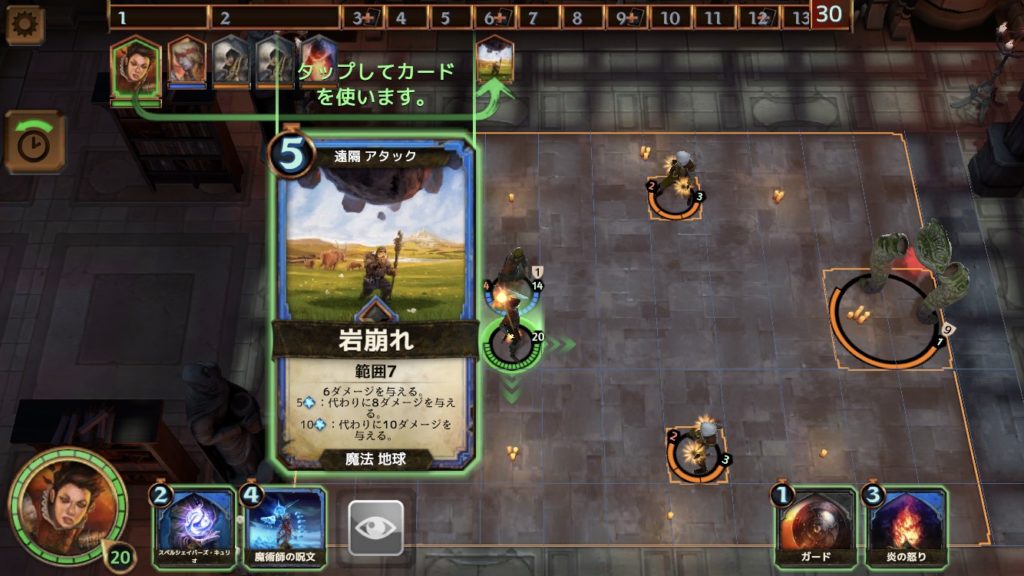 手の内にあるカード「岩崩れ」はフォーカスによってダメージが異なり、5以上で8、10以上で10のダメージを与える。