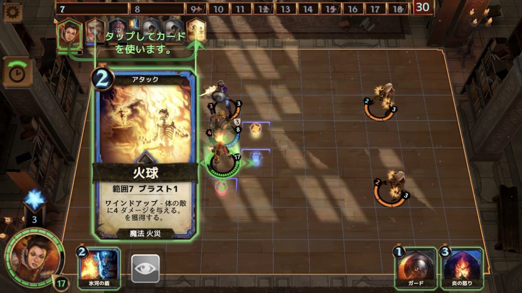 また、火球のカードは、レンナから距離7以内に有効な範囲攻撃だ。指定した場所を中心に、距離が1以内(赤枠の内側)のすべての敵に4ダメージを与える。