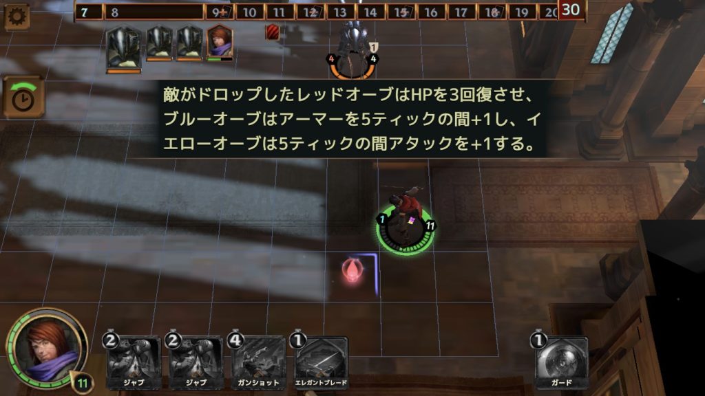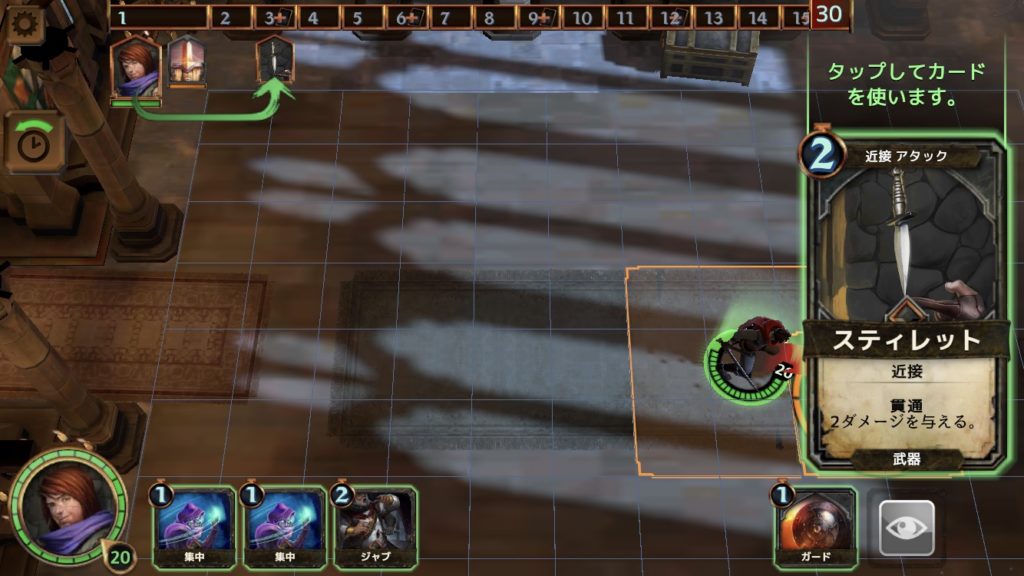 ここで、タイムラインを管理した攻撃を紹介する。手元にある「集中」は、次の攻撃のダメージを+1にするカードで、コストは1だ。このカードを使うと、左の写真では少し見にくいが、4ターンの衛兵の攻撃前に、もう一度行動できる。